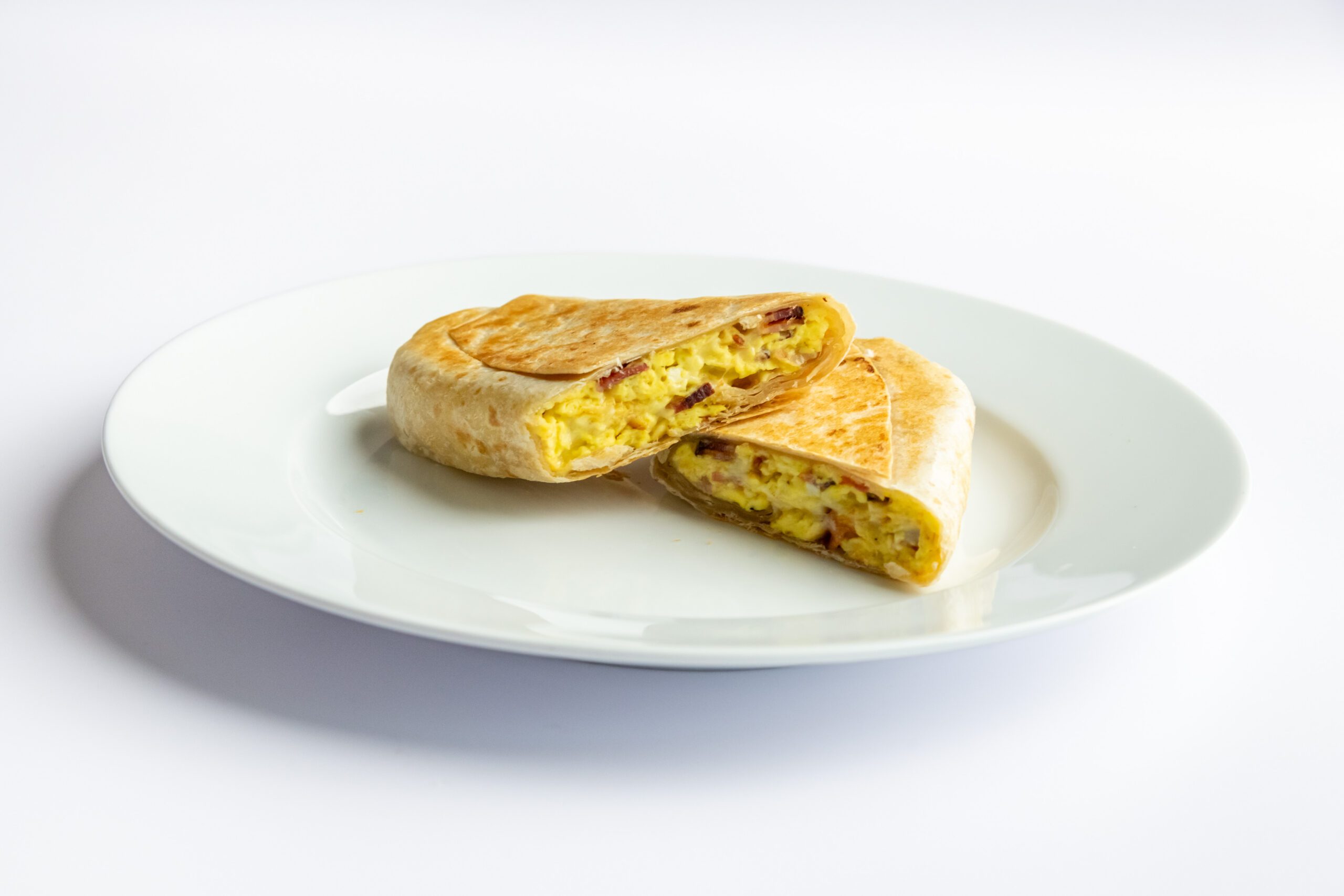 scrambled eggs, bacon, cheddar inside a flour tortilla wrap
