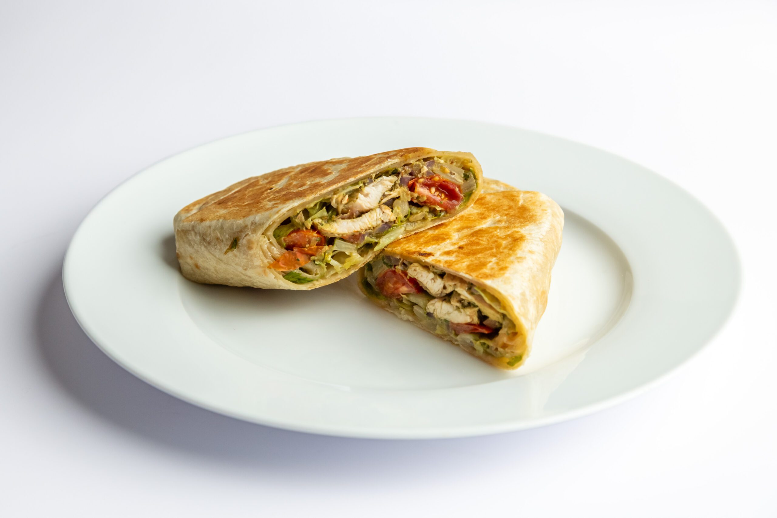 grilled chicken, tomatoes, red onion, sautéed in pesto, with romaine, pressed inside a flour tortilla wrap Contains Nuts