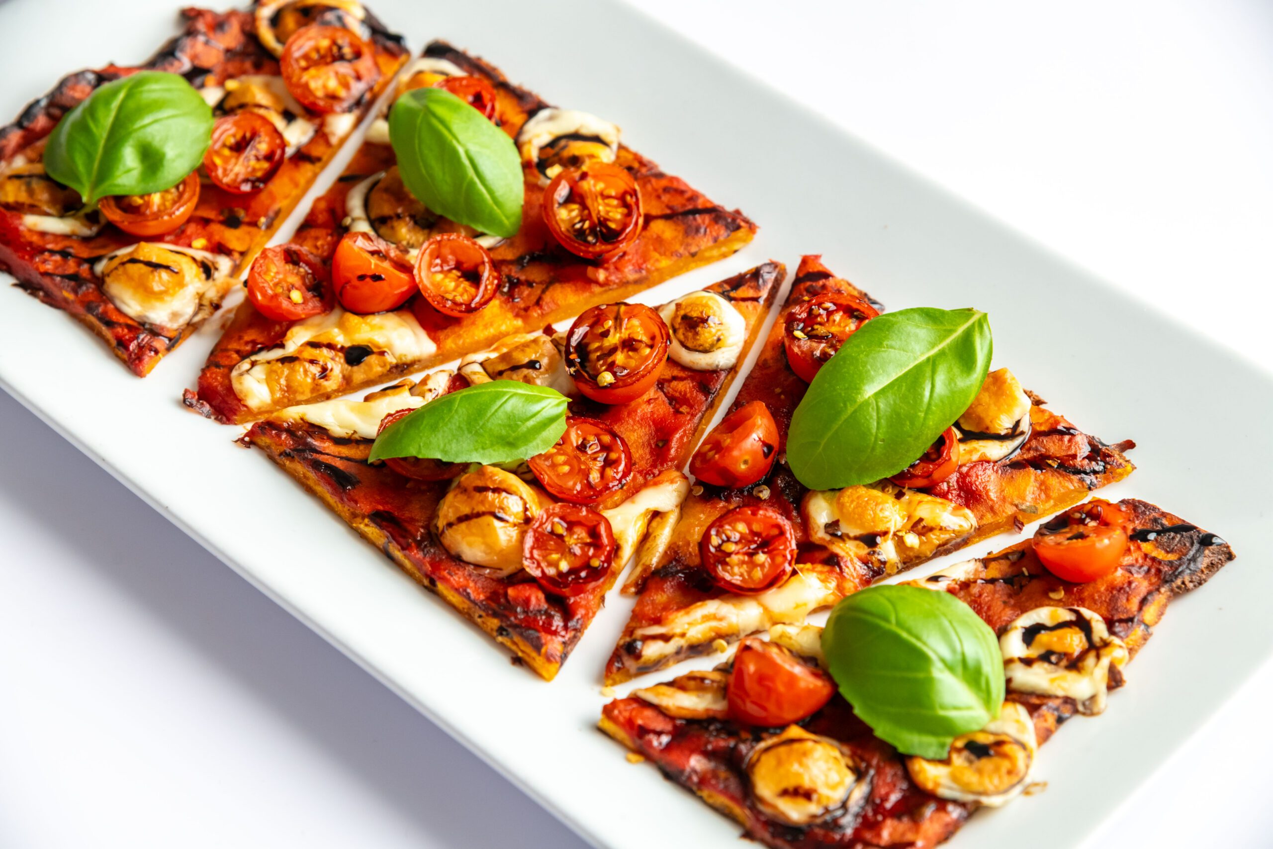 marinara, mozzarella pearls, grape tomatoes, fresh basil, balsamic glaze, chili flakes, sweet potato flatbread