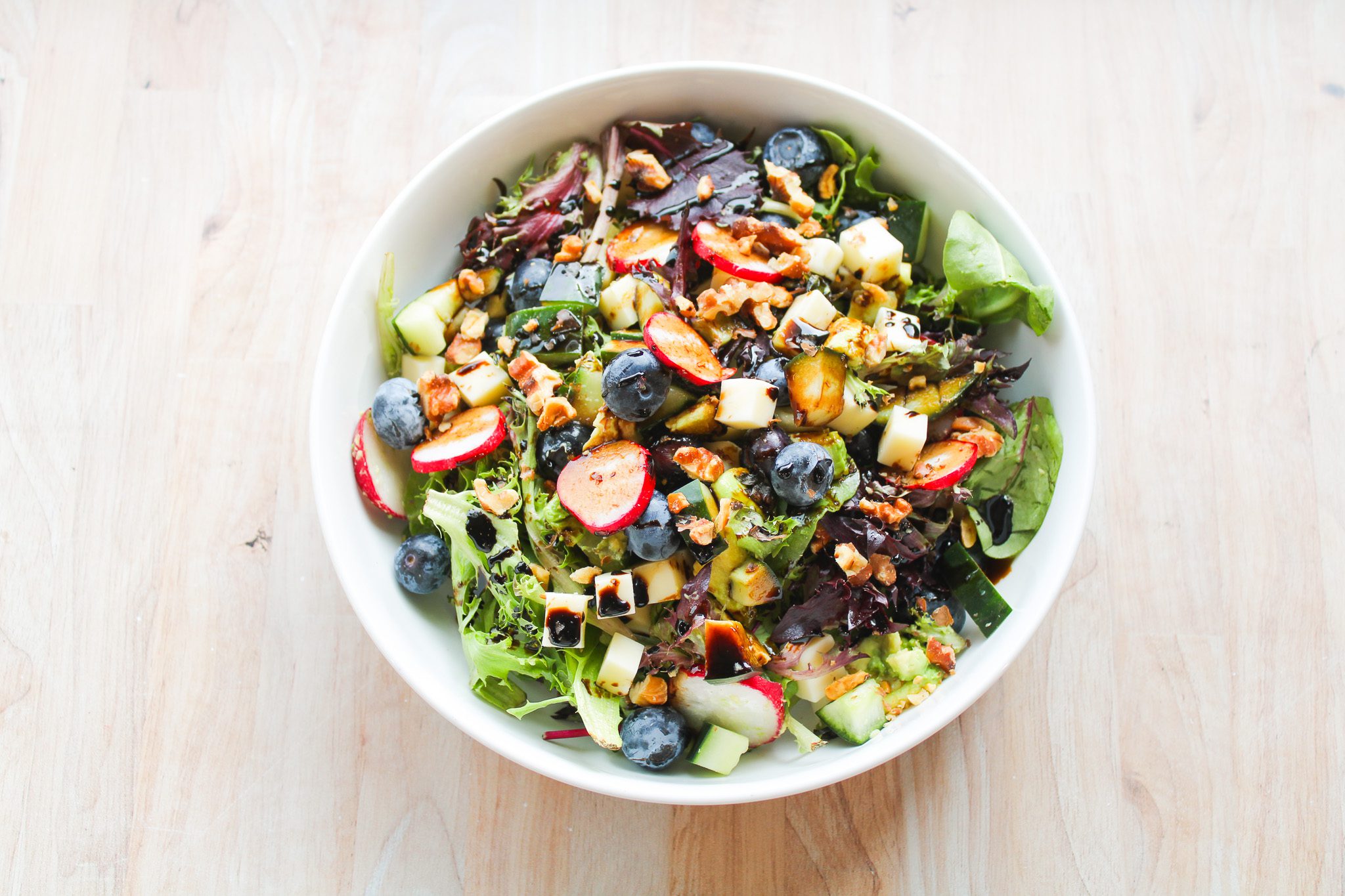 spring mix, cucumber, blueberries, avocado, mozzarella, toasted walnuts, radish, balsamic glaze Contains Nuts